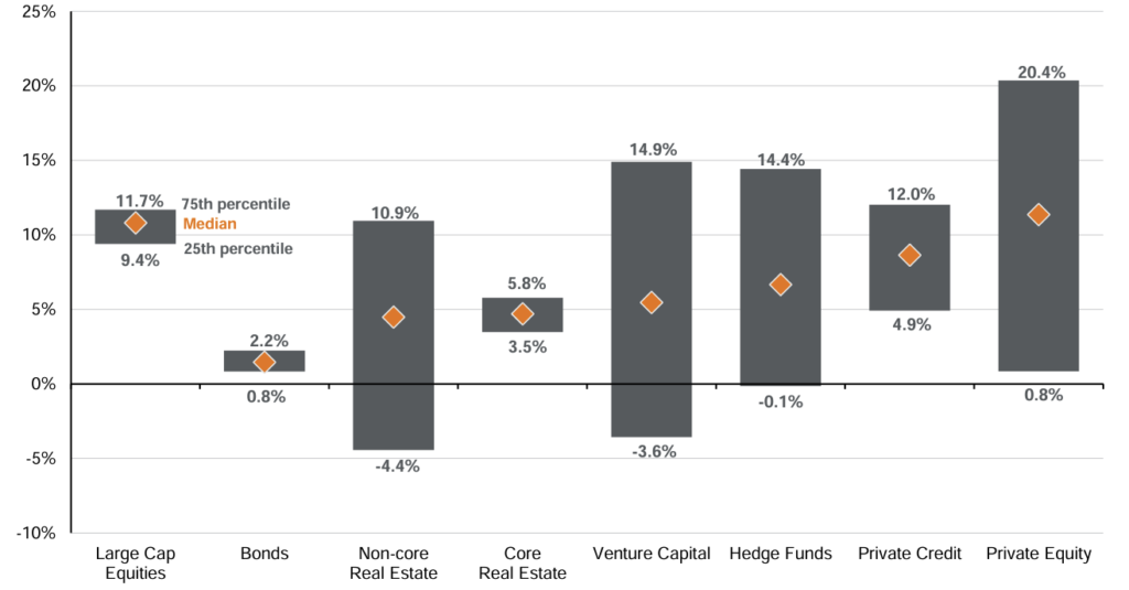 Return dispersion across public and private asset classes (3Q15–3Q25). Interquartile return ranges highlight widening dispersion across asset classes, reinforcing the importance of manager selection, governance and underwriting discipline in portfolio construction.
